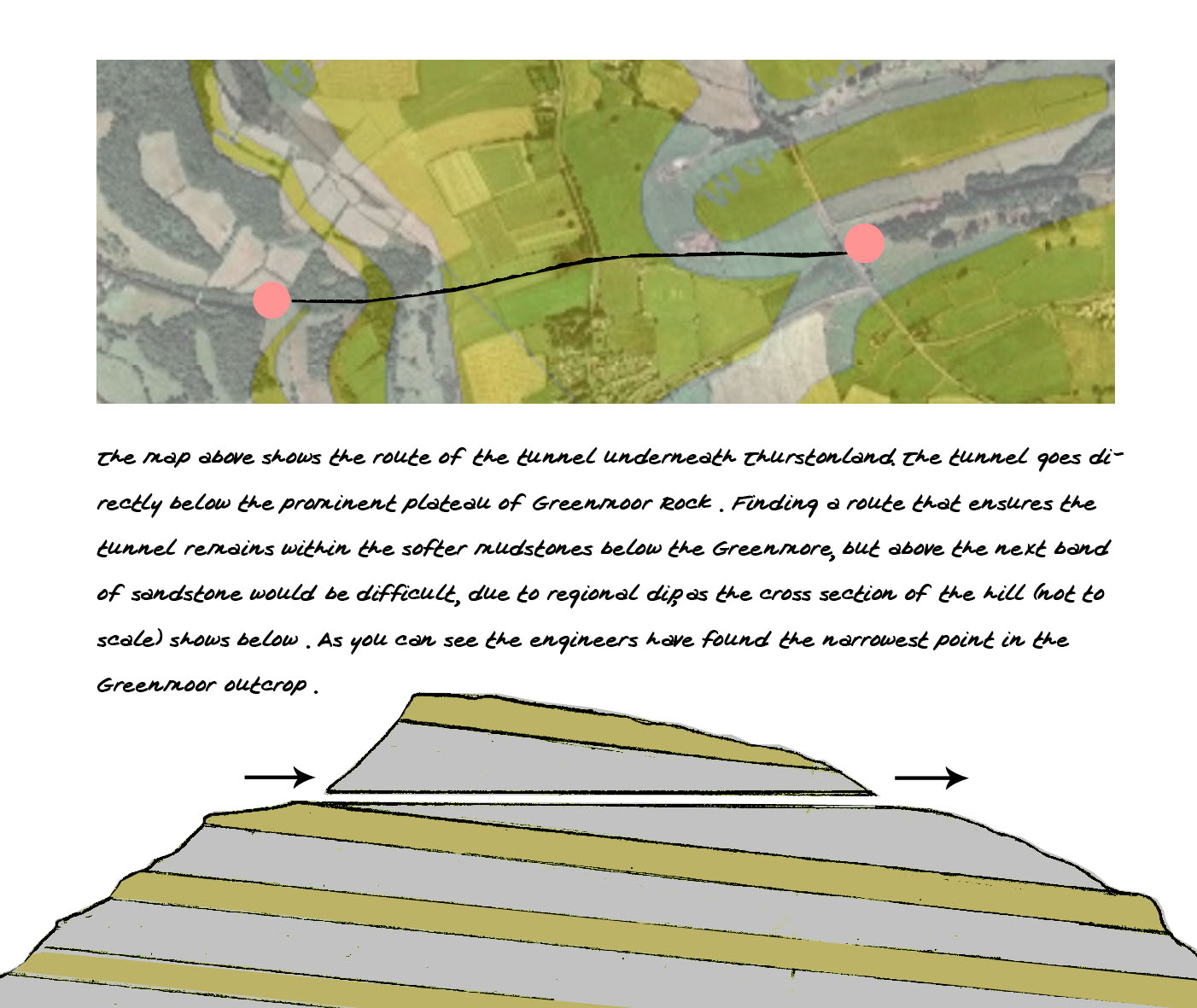 As you cross the railway you can see a tunnel entrance. This is been carefully located here, below the Greenmoor rock, as it was much easier to excavate material from the underlying mudstone. The train therefore travels beneath the protruding Greenmoor plateau to emerge on the other side of Thurstonland.